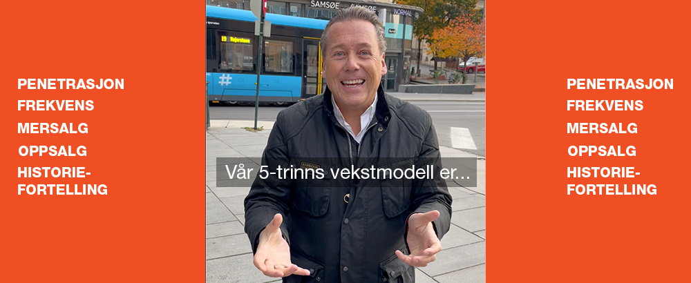 For å klare den jobben best mulig har vi utviklet 5-trinns vekstmodellen vår. Det er fokus på 5 viktige ord/begreper som hver og en bidrar til vekst; PENETRASJON, FREKVENS, MERSALG, OPPSALG og HISTORIEFORTELLING.